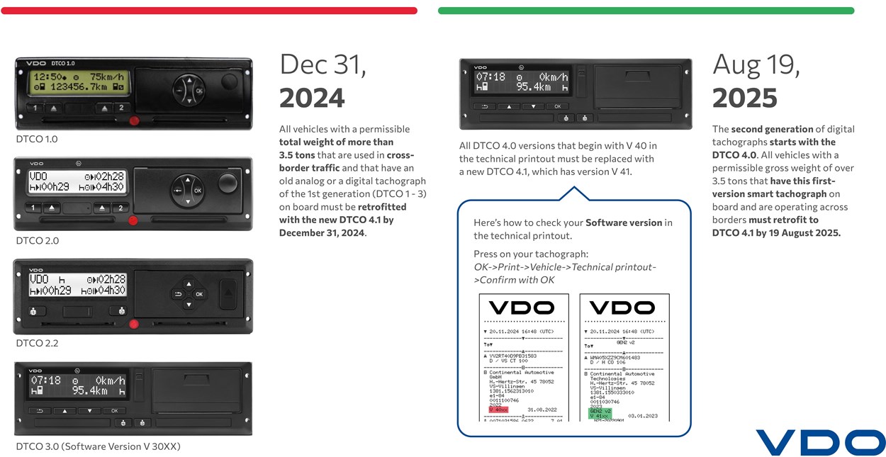 But that's not all: vehicles currently equipped with a smart tachograph of the first version (e.g. DTCO® 4.0 or 4.0e) must also be retrofitted by August 19, 2025, if they are used for international transport.
